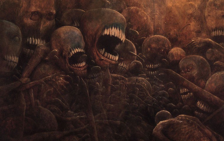杀伐生灵造恶业,血骨亦入口中碎。牲畜地狱中,热而潮湿,虎豹蛇虫遍布,水中恶鱼成群。造孽众鬼入其中,犹如肥羊如狼群,但见那利爪翻飞,蛇吞虎咬,霎时间血肉横飞,不忍相顾。更有撕咬剥皮、巨兽踩踏、水怪吞噬,到处为残肢断臂、肥肠热脑,众在嚎叫中,半日骨肉皆被撕咬成为碎末,方得解脱,一刻之后,又即回复,继续受那牲畜肆虐!