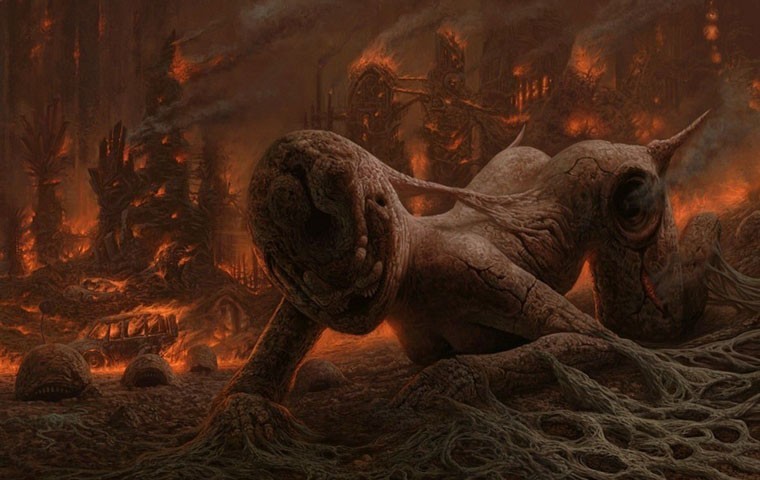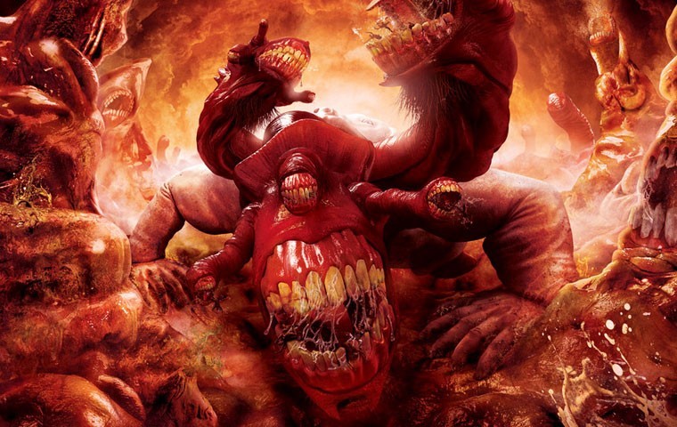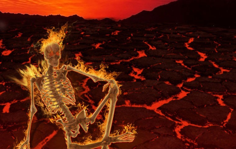 目无天规食人髓,便为火海锅上蚁。八热地狱中,天上不断落下无数炽浆火雹,地面处处腾起猛火,到处皆是滚烫的岩浆,如火横流,众恶鬼在其中,脚一踩上去,即冒出烟,瞬间浑身焦燃烧;又有铁水之海,地狱的恶鬼众生在里面煎熬,痛苦难忍。一旦跌倒,热铁从双肩和头顶径直穿出,燃烧的铁片在身外缠绕,极为痛苦,其苦十倍于前五地狱。