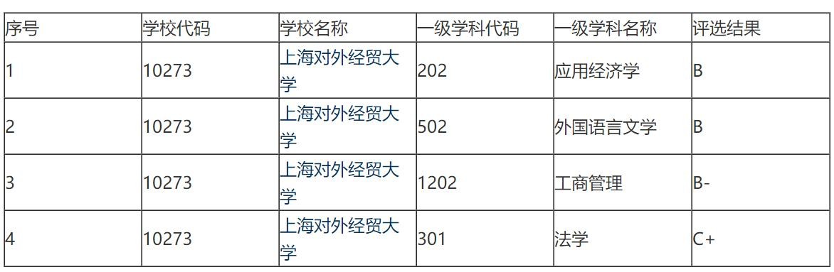 在教育部的第四轮学科评估中,上海对外经贸大学一共4个参评学科,其中应用经济学、外国语言文学为B;工商管理为B-,B类学科共3个;法学为C+,没有A类学科。