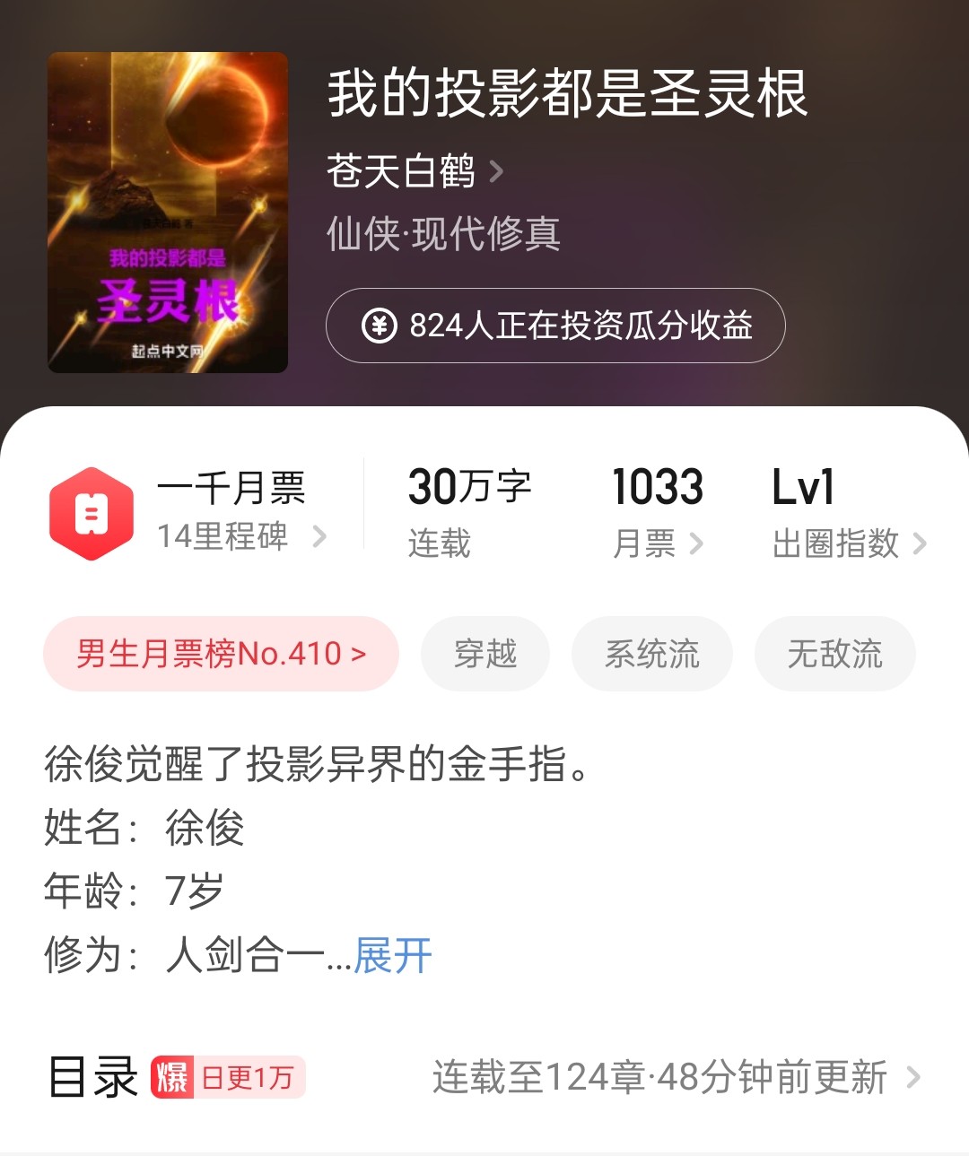 苍天白鹤的新书《我的投影都是圣灵根》已经在上周日上架了,首订四千左右的样子,要比前两本着实高不少。