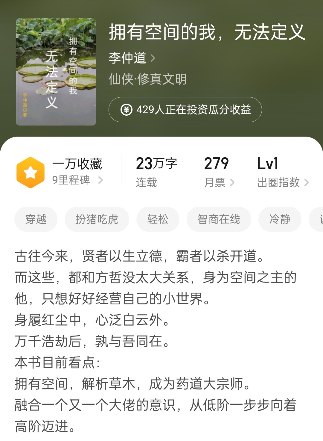 大神李仲道的新书《拥有空间的我,无法定义》也已经上架了。小说首订一千六左右,看着也还行。稳扎稳打写下去,后面精品应该也没多大问题。