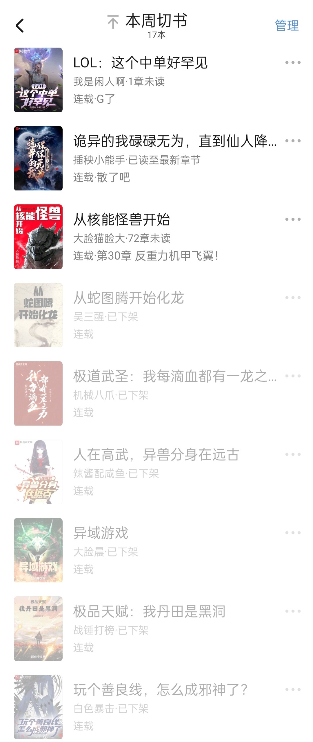 吴三醒、机械八爪等人也切书了,前者上周才开新书,结果这周就割了,后者最近也是一直在切书。至于其他作者,看来也都是成绩不佳,切了的。