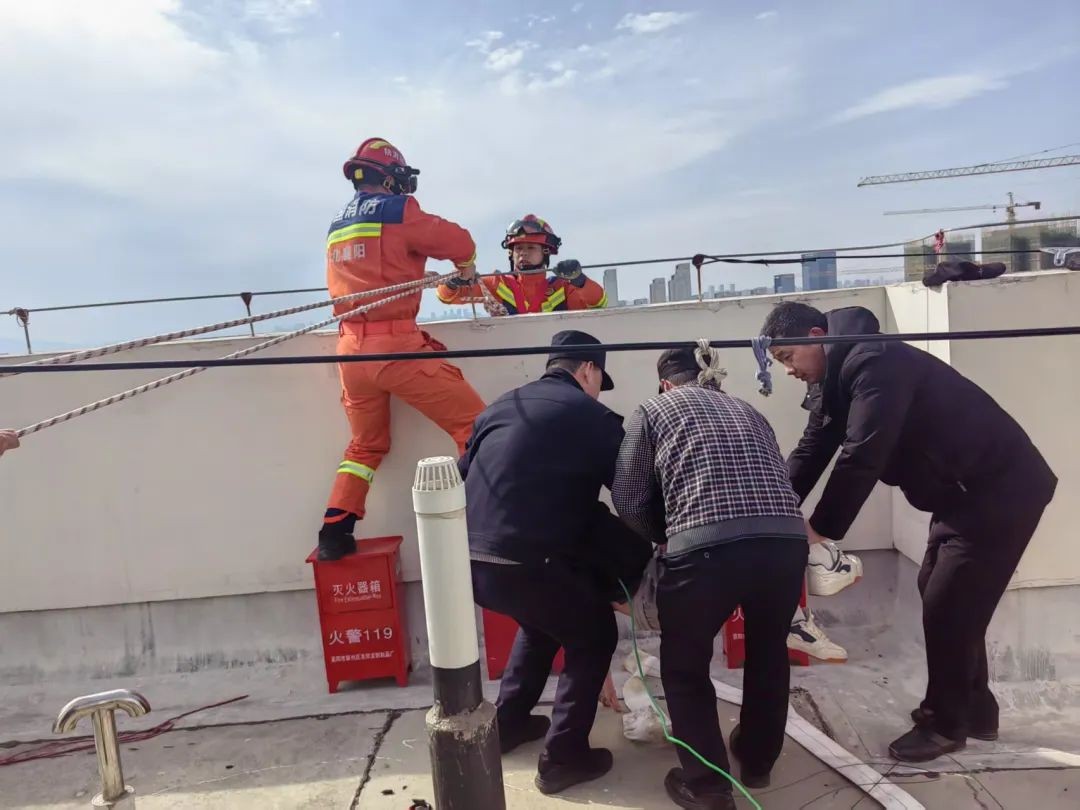 1点58分,派出所民警与消防救援人员抵达该小区事发楼栋,一队人员在一楼地面处充起了安全气垫床,另一队迅速来到顶楼处装备好安全救援绳,对轻生少年实施救援工作。