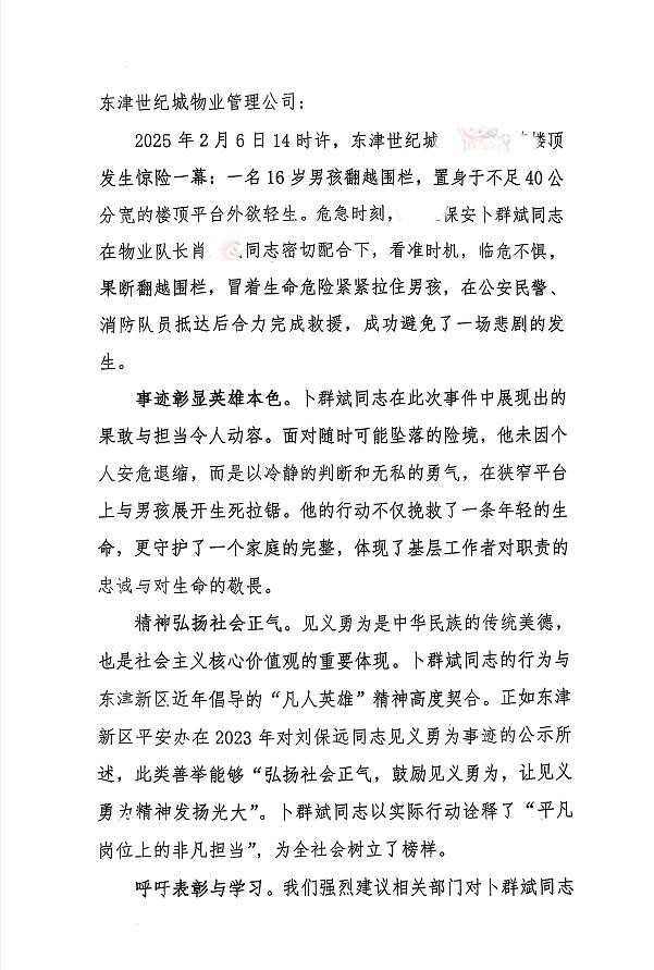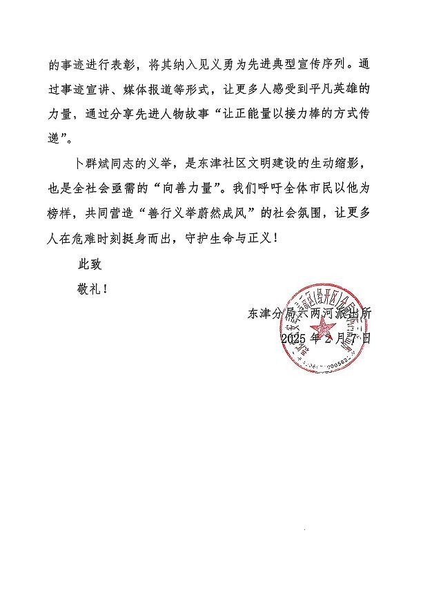 东津公安分局六两河派出所也为民发物业公司送来了一封令人动容的感谢信。表彰卜群斌同志“以实际行动诠释了‘平凡岗位上的非凡担当’,为全社会树立了榜样。”,并呼吁全体市民以他为榜样,共同营造“善行义举蔚然成风”的社会氛围,让更多人在危难时刻挺身而出,守护生命与正义。