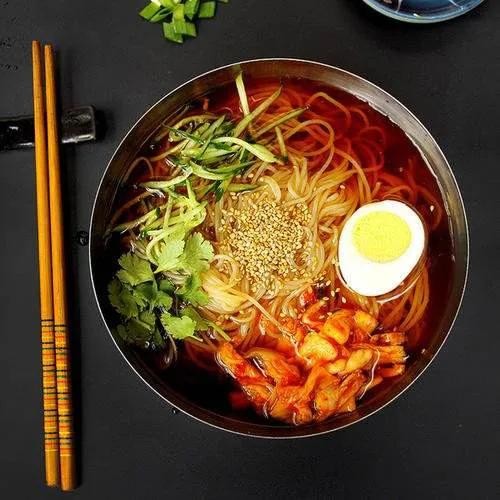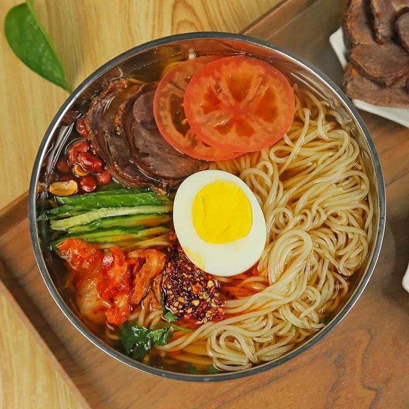 朝鲜面在国内外都受大家喜欢,是一种传统的美食。煮面一般用牛肉汤或者鸡汤,佐料以鸡蛋、肉丝、辣白菜、黄瓜丝、等等。食用之前先放进少量的凉汤或者面条,然后浇汤。面条有韧劲,酸甜可口。