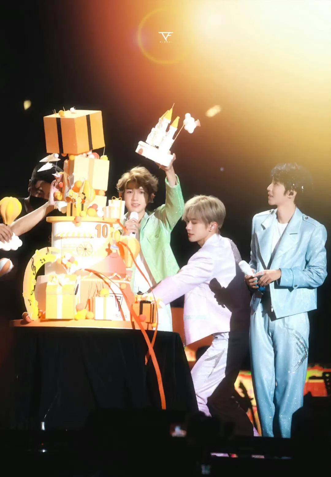 此时出现了一个小插曲-蛋糕塌了,但是不得不说李飞这个央视主持人选的好啊,十周年蛋糕塌了的时候,姐姐说“没关系,三个人的合力托起,这就是十周年的力量,我们给蛋糕一些力量,好吗?”