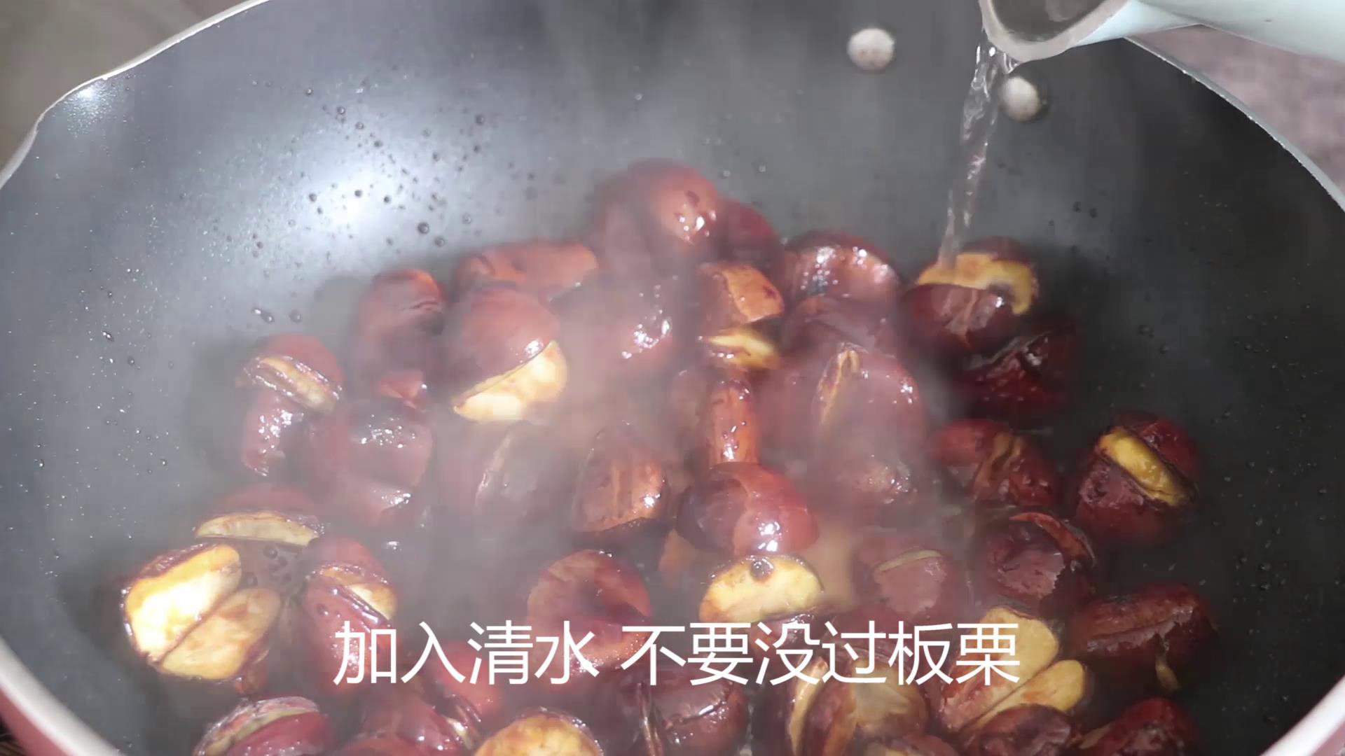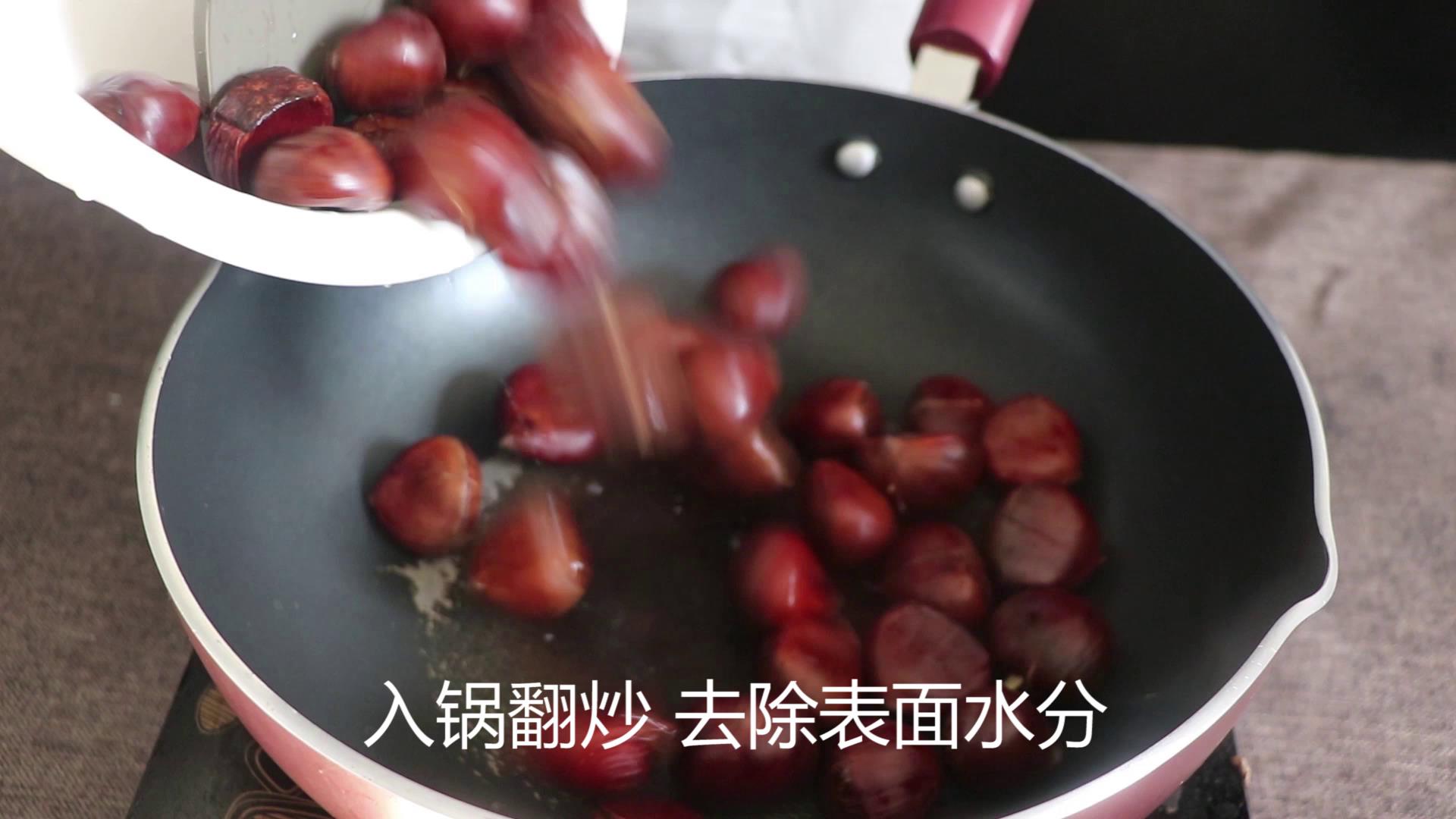现在起锅,板栗放进去,翻炒两下,将板栗表面的水分去除干净。倒入适量的油,蜂蜜和白砂糖。加入适量的清水,不要没过板栗。