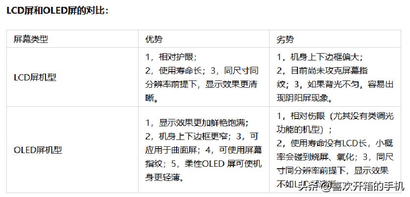 LCD屏幕:像素点是滤光片,靠后面的背光来点亮,所以无法关闭单个像素。优点是不会因为频闪伤眼,缺点是对比度低,较差的LCD屏幕上的颜色在快速移动时有可能会有残影。