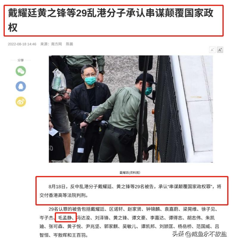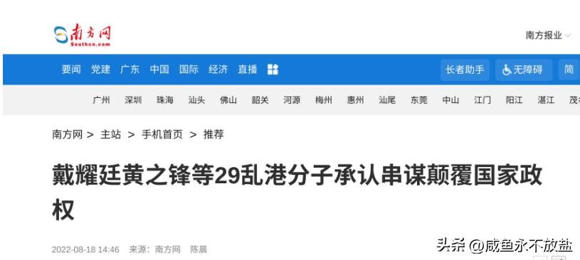 2.南方网2022.08.18《戴耀廷黄之锋等29乱港分子承认串谋颠覆国家政权》