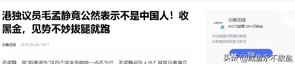 1.北晚在线2019.09.04《港独议员毛孟静竟公然表示不是中国人!收黑金,见势不妙拔腿就跑》