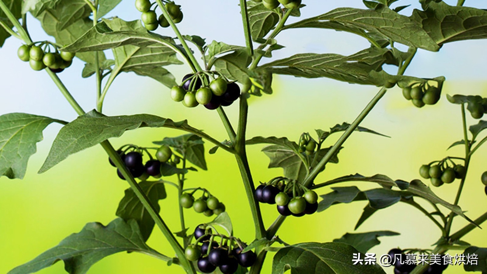 龙葵:茄科、茄属一年生草本植物,全草高30-120厘米;茎直立,多分枝;卵形或心型叶子互生,近全缘;夏季开白色小花,4-10朵成聚伞花序;球形浆果,成熟后为黑紫色。浆果和叶子均可食用,但叶子含有大量生物碱,须经煮熟后方可解毒。