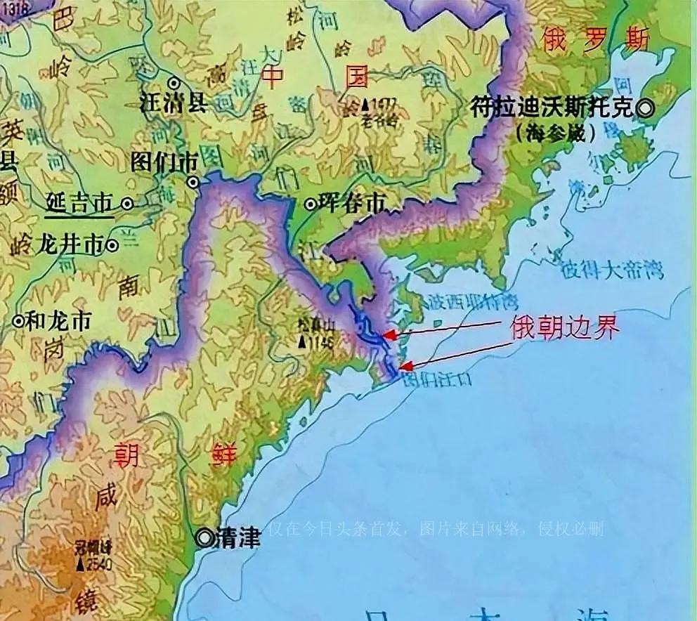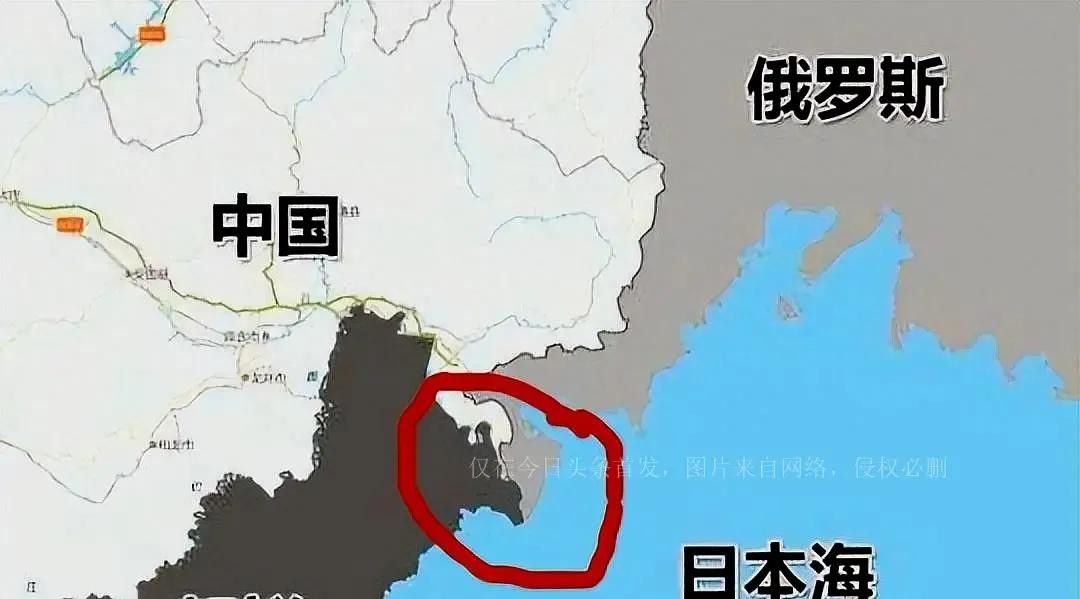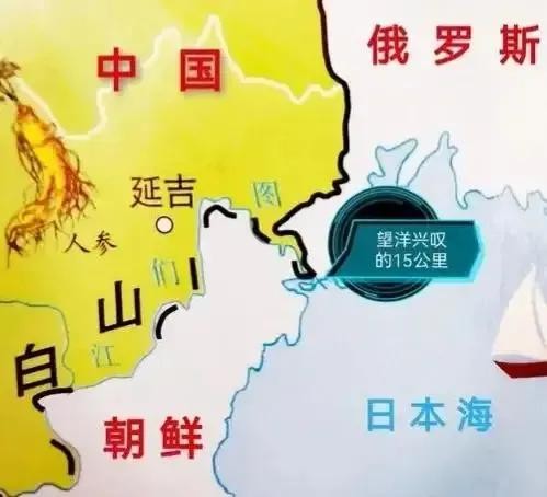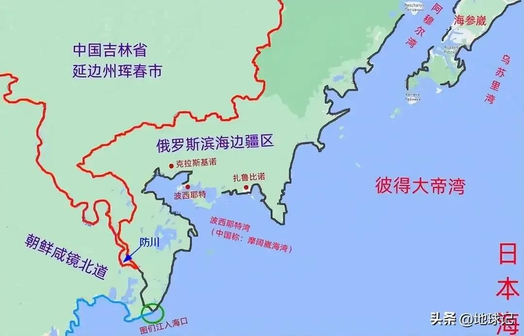 图3,本来图们江的入海口是我国,因为一系列原因丢掉了,于是吉林省变成了内陆省份,可惜了这望洋兴叹的13公里(直线距离只有10公里)