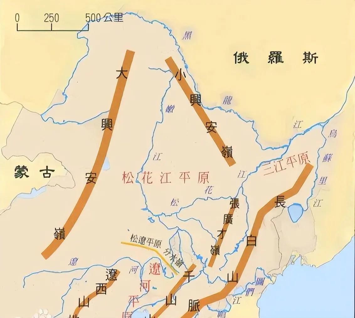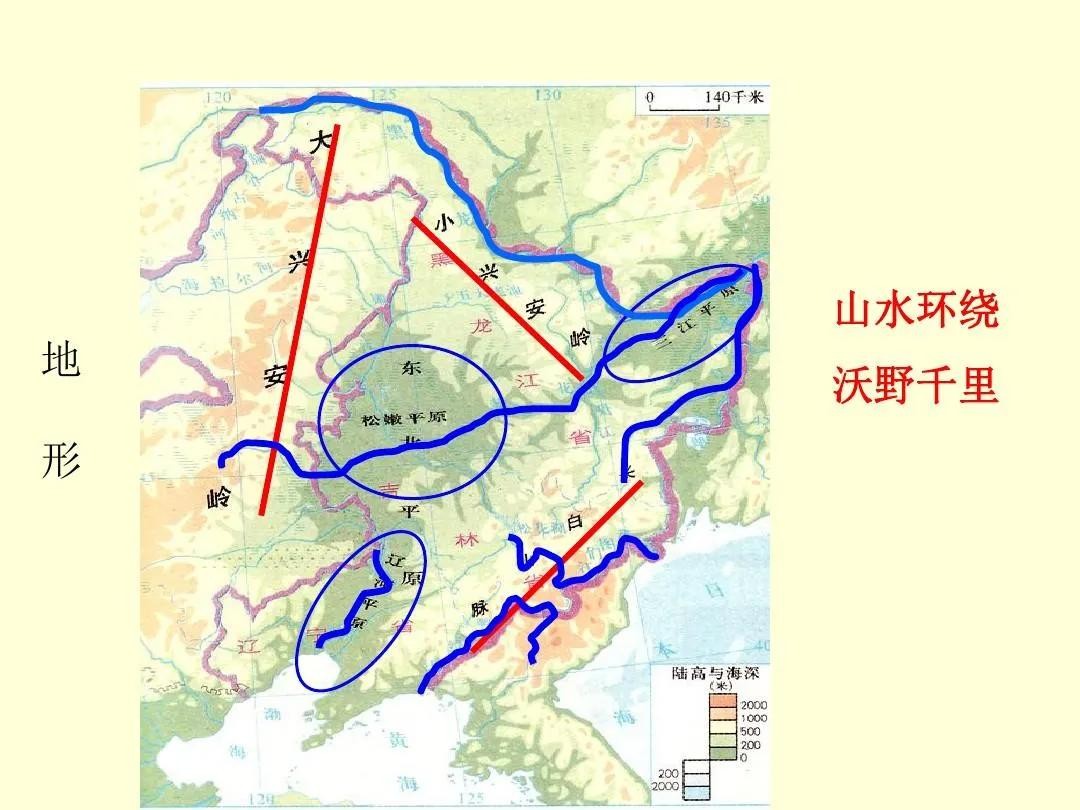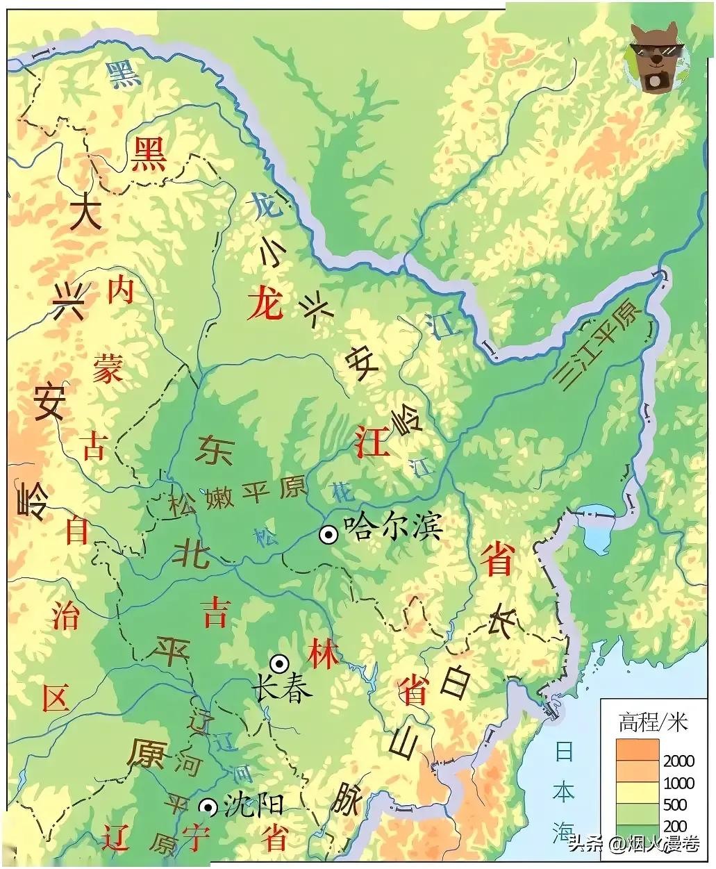 可以很直观看到东北地区的山脉(燕山、长白、大兴、小兴)