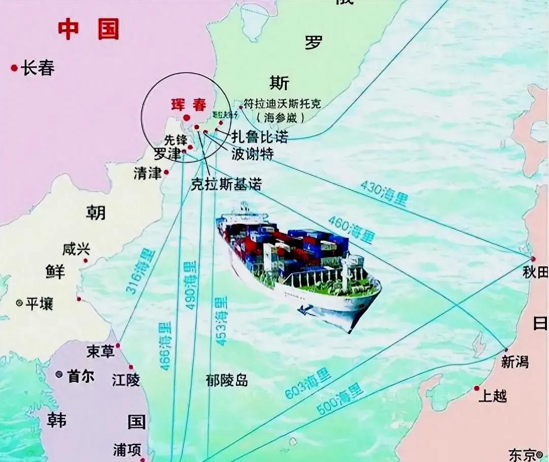 图5,东北的珲春与朝鲜、韩国、日本、俄罗斯的城市之间的距离示意图