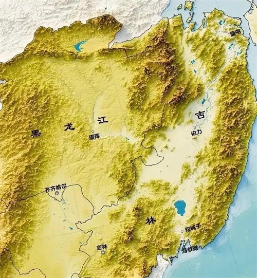 图1,东北地区的地势地形图及其主要城市一览。可以看到长白山脉、小兴安岭、大兴安岭以及部分燕山山脉的轮廓,以及辽河、鸭绿江、松花江、黑龙江河谷的轮廓。还有渤海边的辽西走廊的走向。