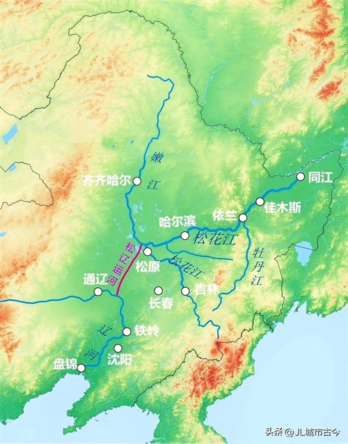 图7,东北平原的水系、松辽运河(规划中)示意图