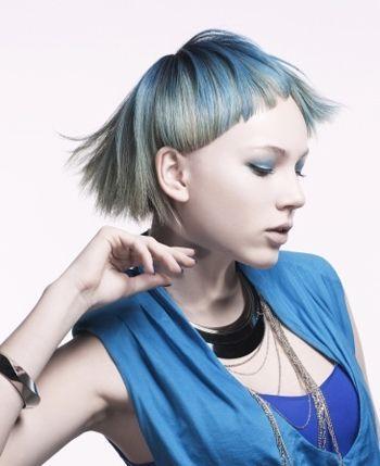 带有个性渲染的短发沙宣发型带有不规则的修剪方法,这款浅亚麻色的直发在发顶采用了浅蓝色的挑染让发型看起来更有层次感,超短的刘海搭配碎发轻舞的直发发丝冷艳时尚。