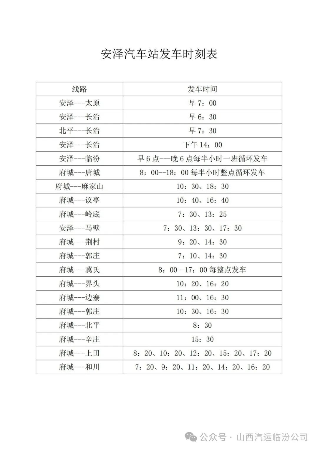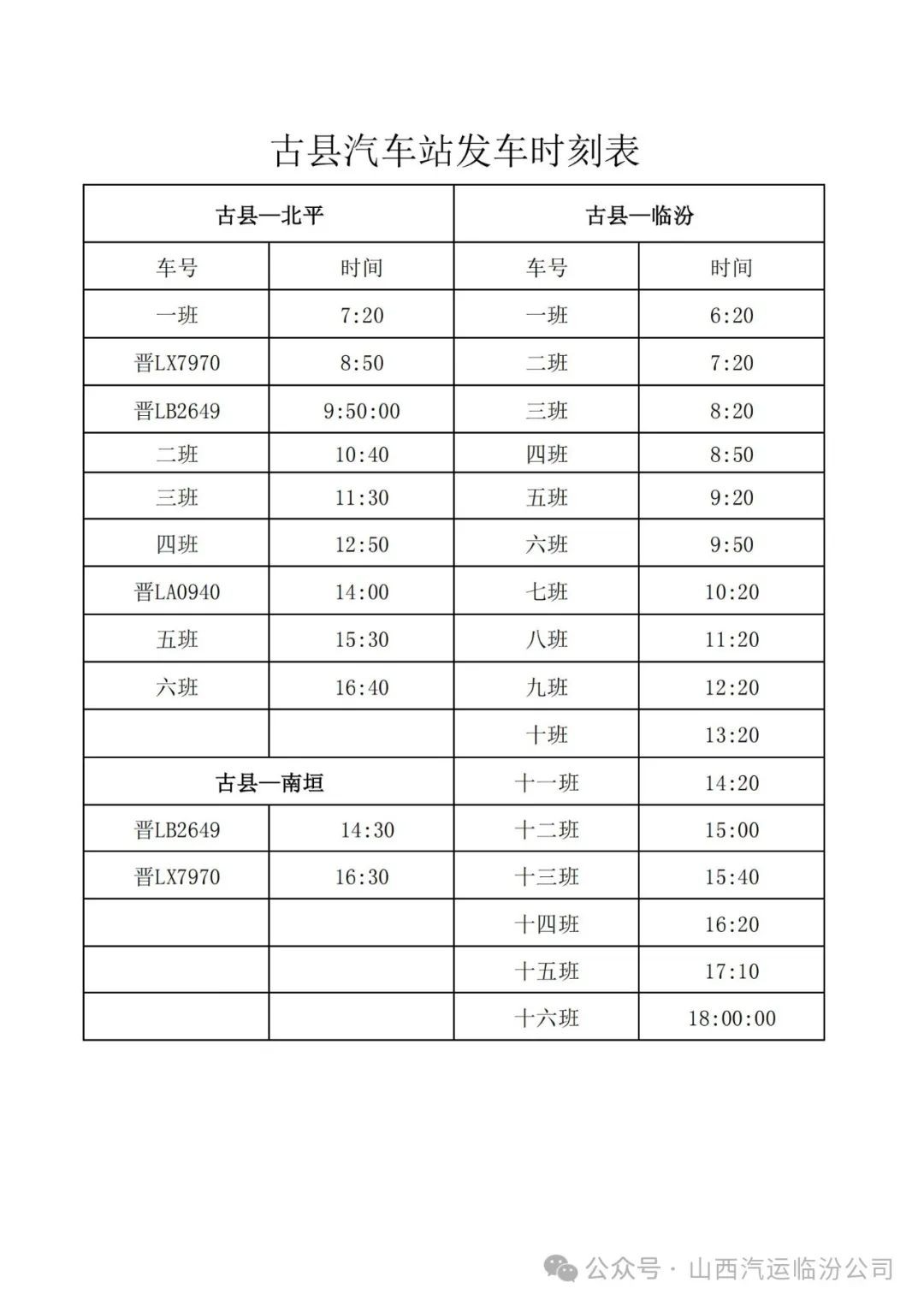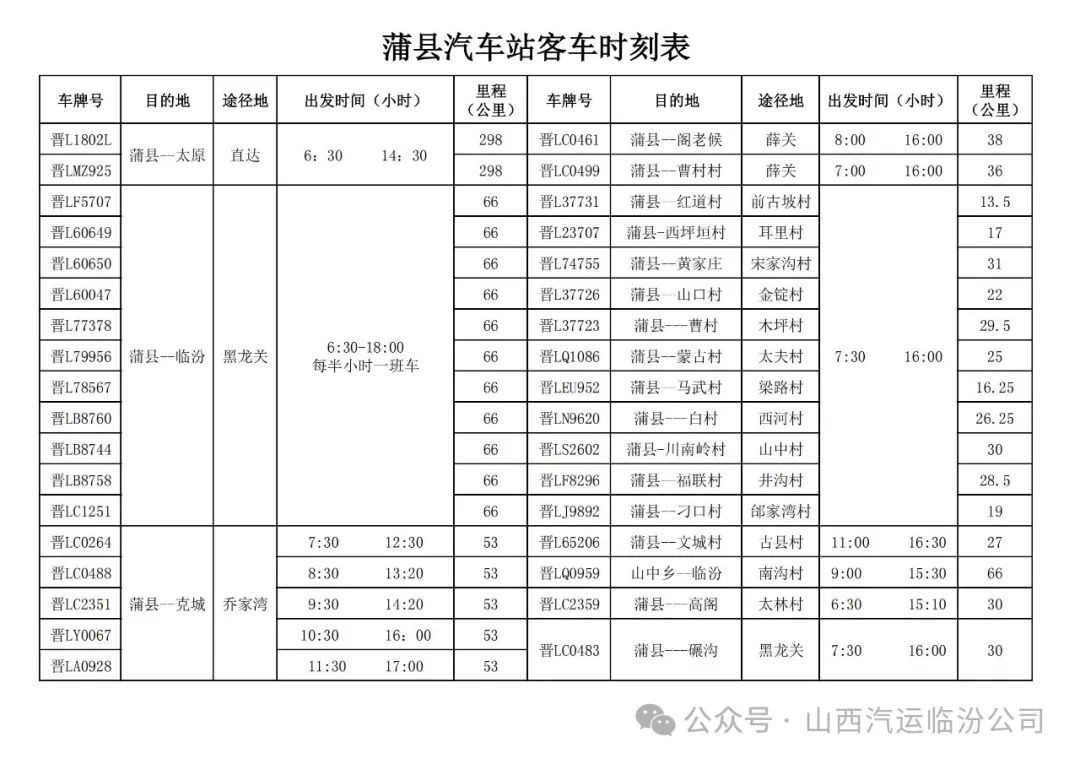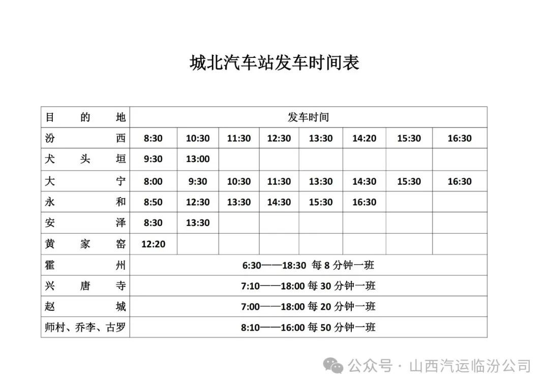 为了给各旅客提供一个平安、便捷的回家旅程,我们将临运城西客运站、城北汽车站、安泽汽车站、古县汽车站、蒲县汽车站、隰县汽车站,各站、车次、时段发车表提供给大家。