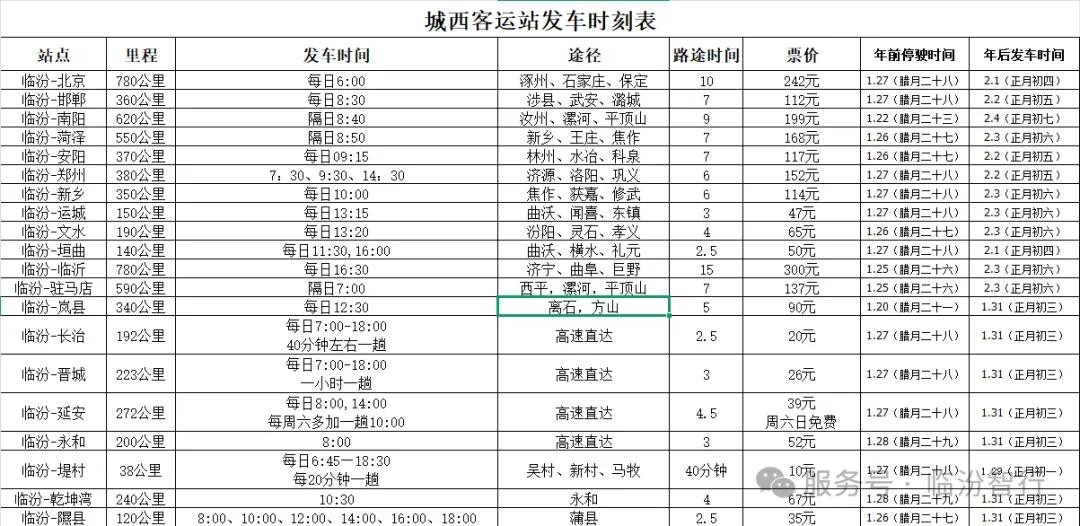 临汾城西客运站最新发车时刻表 | 附放假安排、客服电话