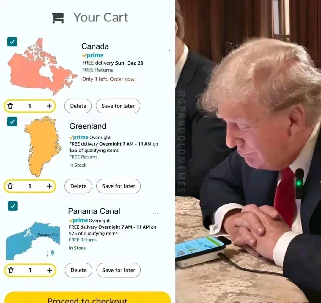 这张图,先是他的儿子埃里克·特朗普贴出来。图右边,特朗普在认真看手机;图左边,手机上显示的是一张购物单,菜篮里有三项货物。