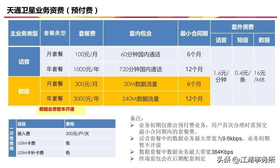 以下是中国电信此前公布的天通卫星业务资费,不过目前资费已经进行了调整。