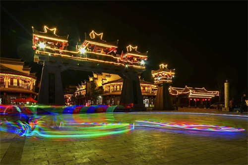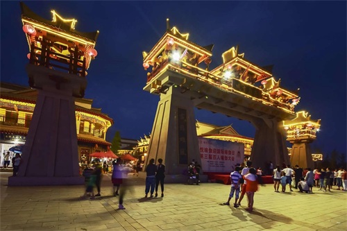 燕都古城的夜景灯光亮起,街道旁鳞次栉比的商铺,皆是仿古建筑,只见那飞檐微翘、碧瓦朱甍,一砖一瓦在灯火的映衬下,一两分古韵绕梁,颇有夜市千灯照碧云的锦绣之意,让这条现代化的夜市,增添了一抹不一样的风采。