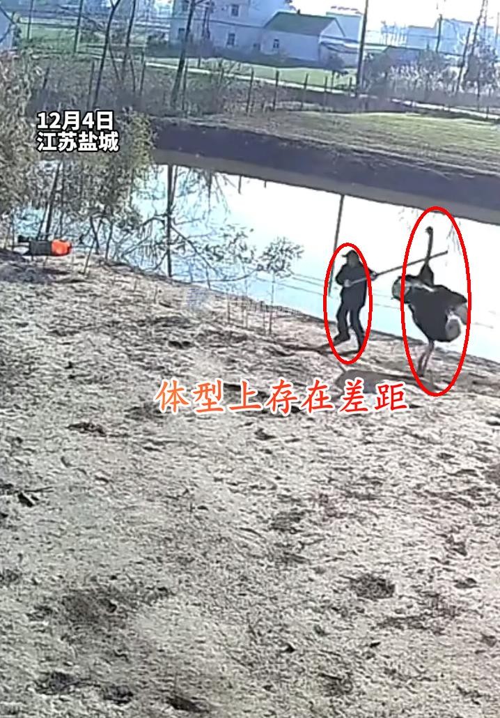 长江君:确实,从画面上看,这只鱼塘里的大鸵鸟非常的硕大,无论是身高还是体型都远远超出这位盐城钓鱼人——据鱼塘主称,这只鸵鸟有200多斤。