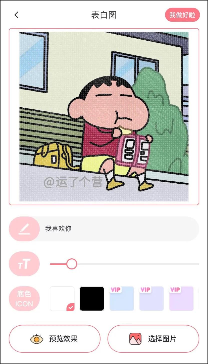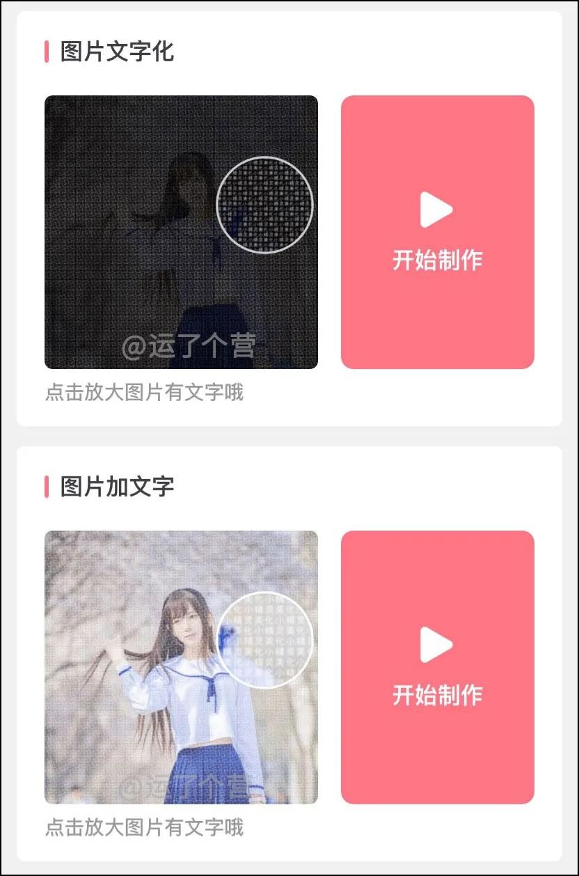 我们先来看看第一款“图片文字化”,意思就是将图片内容转化为表白字。