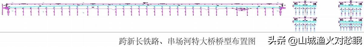 跨新长铁路、串场河特大桥:桥位处河口正宽约63m,水面约57m,跨径设计不小于40m。