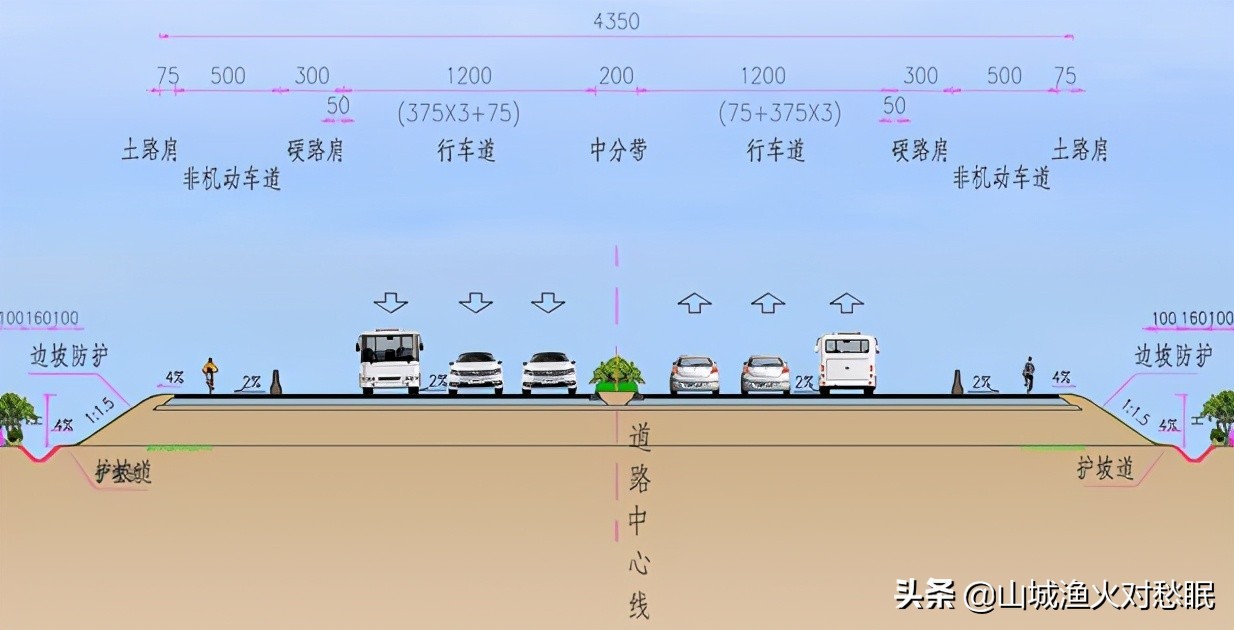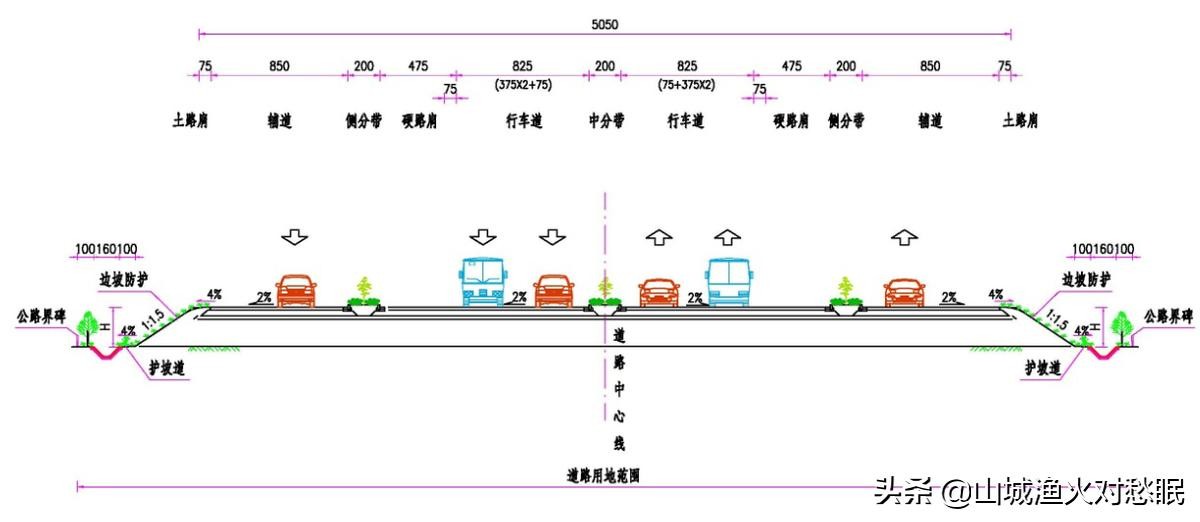 站城大道互通至老204国道互通段双向六车道,路基宽43.5米;老204国道互通段至规划331省道主路为双向四车道,路基宽43.5米,辅路为双向两车道;便仓镇区段高架桥路段为双向四车道,路基宽46米;规划331省道至终点段为双向四车道,路基宽26米。