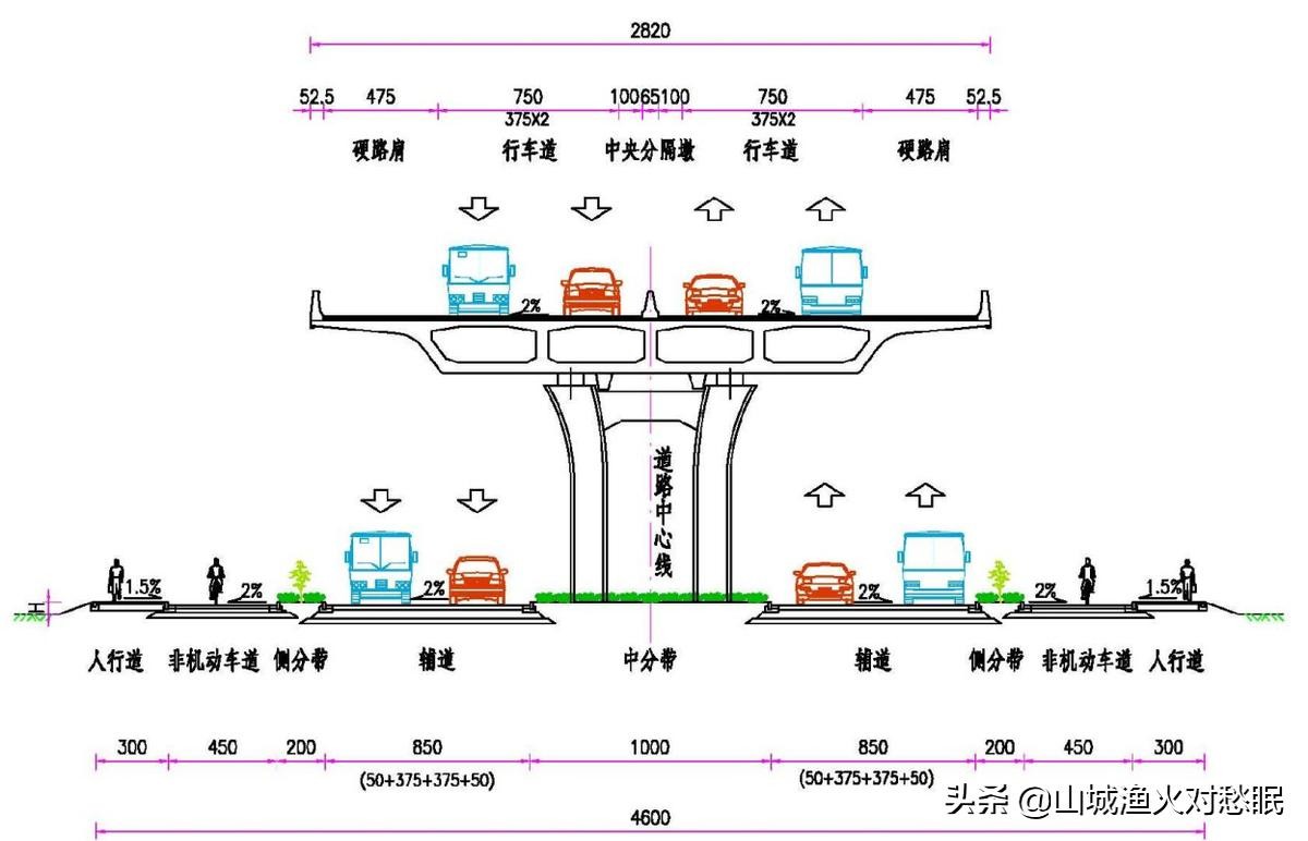 便仓镇区高架桥:采用高架+地面辅道的断面布置型式,高架设计速度为100km/h,地面辅道设计速度为60km/h,桥下通行净空不小于5.5m。