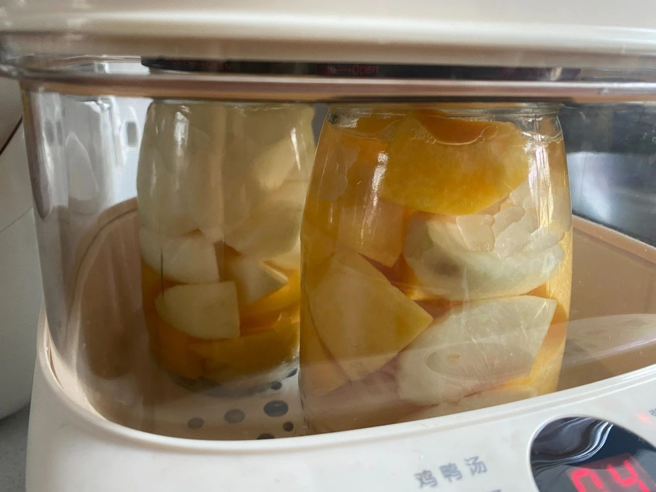 4、蒸熟后再次确认一下盖子是否拧紧,然后将瓶盖子朝下,形成真空的环境就可以了。这样罐头制作好,可以保存很长的时间,也不用放冰箱,一年之后都不会变质。