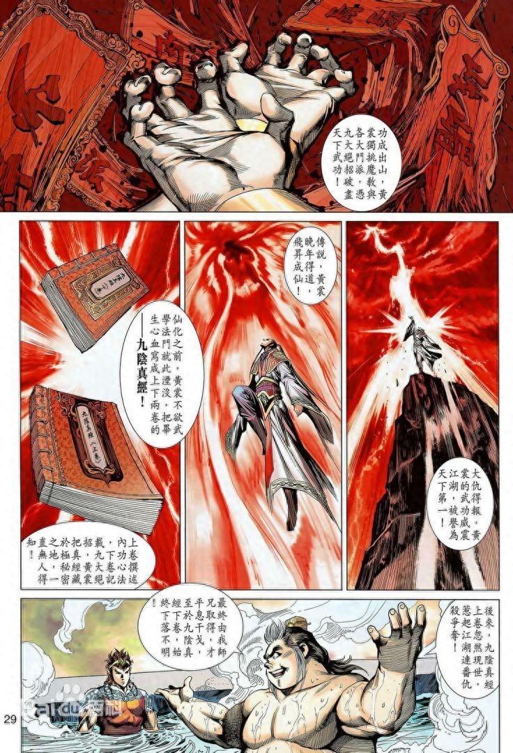 大仇得报,黄裳武功威震江湖,被誉为天下第一。传说,他晚年修行功深,终于得道圆满,羽化飞升。又有传说,在黄裳飞升之前,他把自己的毕生心血,撰写成两部书册,正是“九阴真经”上下两卷。上卷是内功心法,下卷则是武学招式。