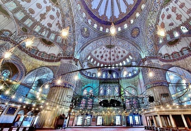 具有气势恢宏、造型奢华独特的宗教建筑,30多座圆顶加6座宣礼塔,因内部铺满蓝釉瓷砖而称其为蓝色清真寺。