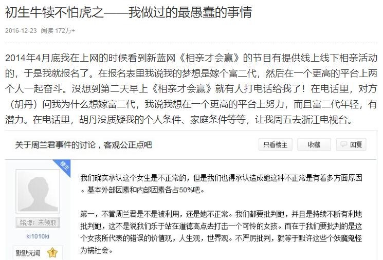 带着这种想法,周兰君上了浙江卫视的相亲节目,寻求富二代对象。