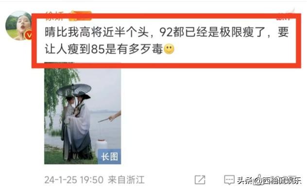 当于正要求旗下身高1米7的女演员赵晴从92斤减至85斤,称“瘦到骨头凸出才上镜”时,徐娇直接转发微博开怼:“瘦成这样您就觉得好看了”。
