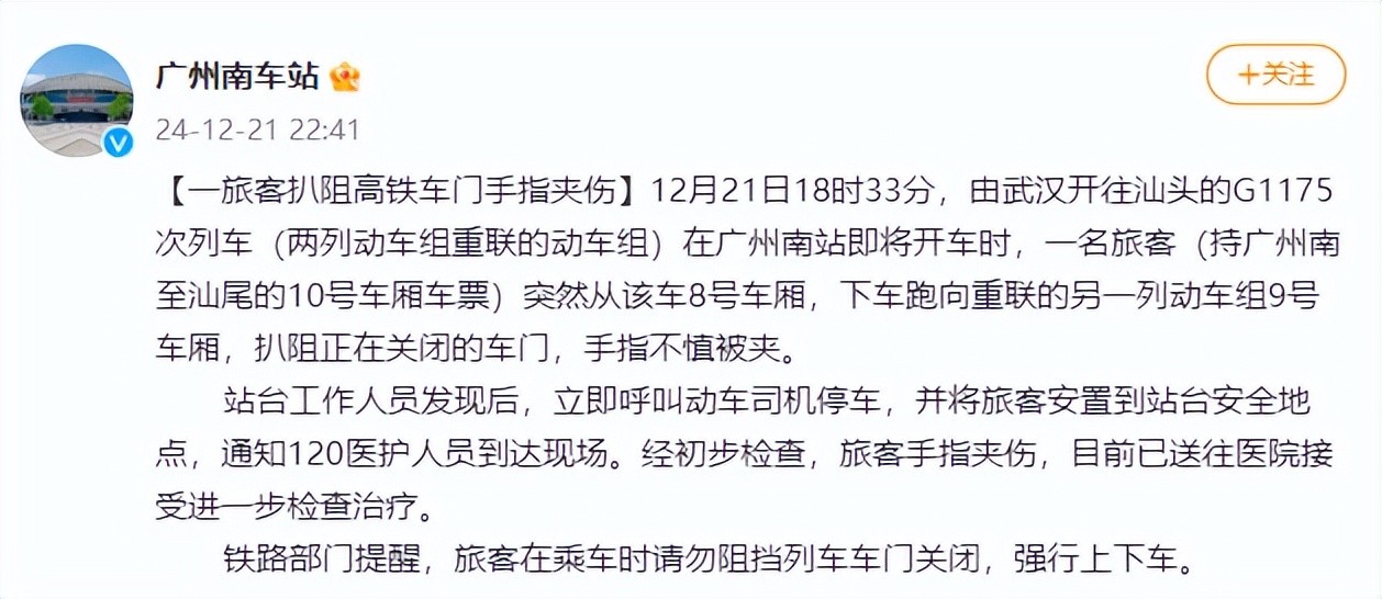 12月21日18时33分,由武汉开往汕头的G1175次列车(两列动车组重联的动车组)在广州南站即将开车时,一名旅客(持广州南至汕尾的10号车厢车票)突然从该车8号车厢,下车跑向重联的另一列动车组9号车厢,扒阻正在关闭的车门,手指不慎被夹。