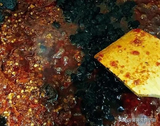 7、辣椒熬制15分钟后,辣椒水分快干时,可以加入豆豉,搅拌均匀。