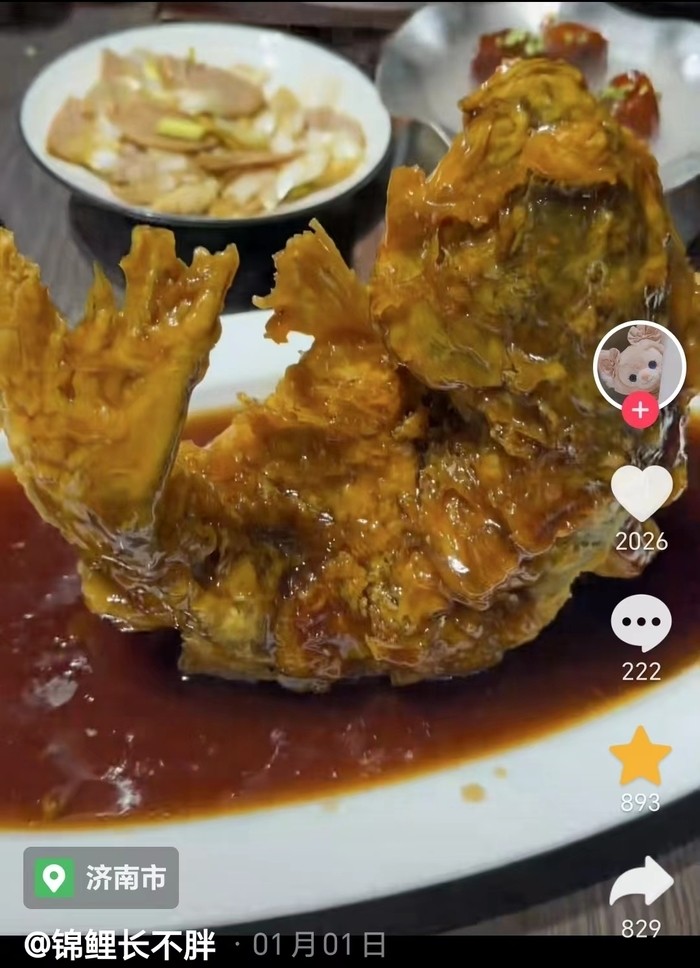 边旅游边干饭,网友“锦鲤长不胖”表示在行。把子肉、老周家牛肉烧饼、羊杂汤、鱼汤粉、魁盛居、孙家糖油条、秦记火烧、超意兴、梅飞酒家……“锦鲤长不胖”在魁盛居品尝了非遗菜品“九转肥肠”“糖醋鲤鱼”。魁盛居是百年鲁菜馆,始于1919年,致力弘扬鲁菜饮食文化,讲好鲁菜故事。其“糖醋鲤鱼”取黄河鲤鱼,呈“鱼跃龙门”状,一年售10万份。
