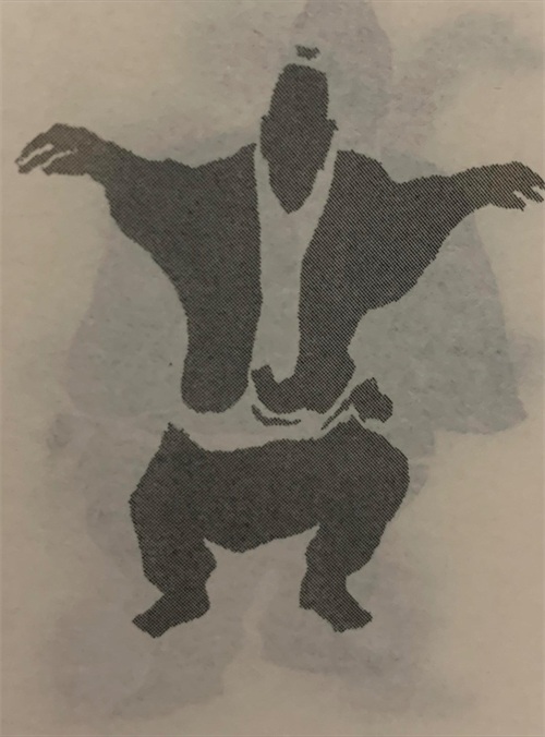 微微下蹲,双手顺势作仙鹤展翅,手臂、手掌、手指配合全身肌肉呈自然柔和起伏飞翔状态。
