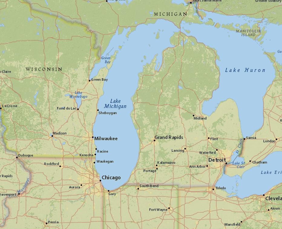 密歇根湖同样是北美五大湖之一,也是五大湖唯一一个全境均位于美国境内的湖泊,其面积约为58016平方千米。密歇根湖的平均深度约为84米,最深处达到了281米,整个湖泊的总蓄水量约为4918立方千米。著名城市芝加哥就位于密歇根湖的南端。