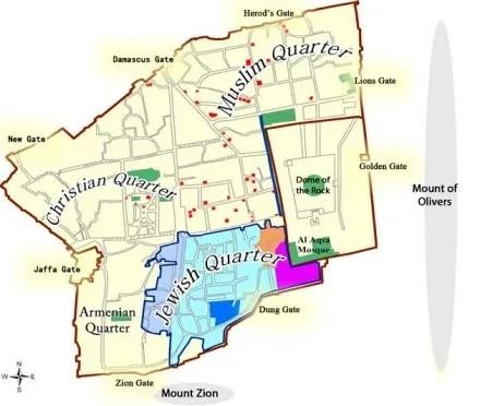 耶路撒冷由以色列实际控制(第一次中东战争后,以色列占领西耶路撒冷。第三次中东战争后,以色列占领东耶路撒冷。)。位于犹大山地,介于地中海与死海之间,面积只有126平方公里。著名景点有犹太教的哭墙和圣殿山、穆斯林的圆顶清真寺和阿克萨清真寺,以及基督徒的圣墓教堂和苦路。老城城圈面积约1平方公里,划为4个区,老城东南0.14平方公里的圣殿山,是圣城中的圣城。耶路撒冷东部为穆斯林区,包括著名的神庙区。神庙区的圣地有摩哩山的岩顶(伊斯兰教)及岩顶上的圣殿(伊斯兰教)、阿克萨清真寺、哭墙(犹太教),圆石清真寺与哭墙相邻,建在犹太教圣殿的遗址上,因此成为犹太人与穆斯林宗教冲突最为激烈的地区。西北部为基督教区,面积最大的一个区,有基督教的圣墓教堂。西南部为亚美尼亚区,面积最小。南部为犹太教区。城西南面的锡安山为犹太教又一重要圣地。城东的橄榄山有基督教与犹太教圣地。