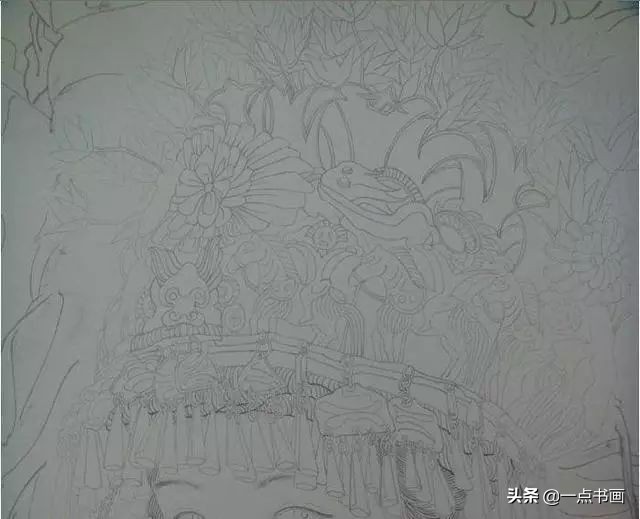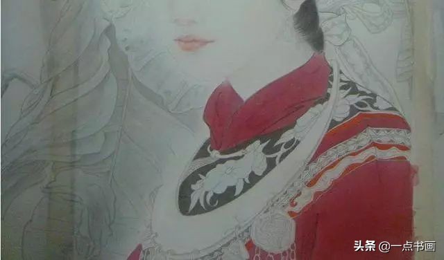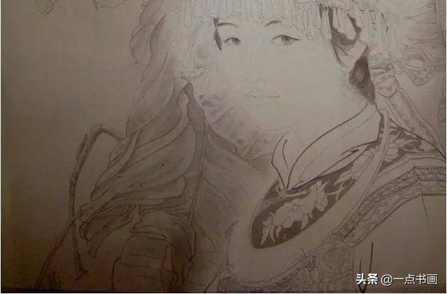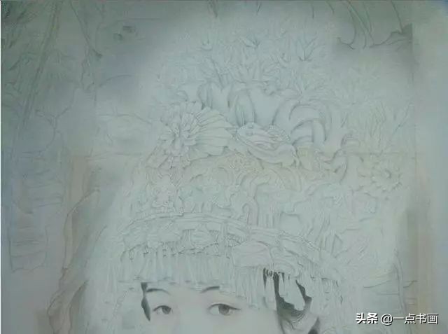 1、先把绢绷在框上,因为绢很透明,所以很容易就看得清素描稿的形,勾线时注意深浅,如头饰的里面勾得稍重些,边缘就要浅些。(为了产生虚幻的效果)因为衣服是红色的,所以墨线要粗些和重些和有变化些,勾线时注意起笔,收笔。重要的眼睛和睫毛、眉毛要分多几种墨色去勾,这样不会很死。