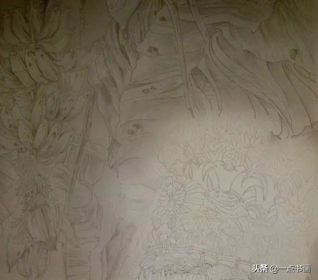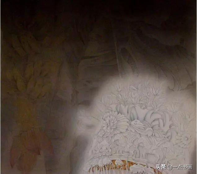 4、背景处理成弱对比,这样就会退进去,芭蕉着了一点黄和红,为了和主体人物身上的颜色呼应。白色是加了云母的,也加了一些骨胶,增加附着力。调整完成。