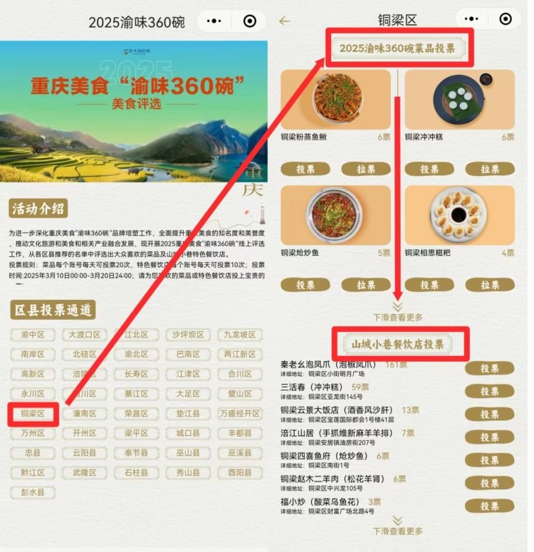 在2025年3月10日00:00~3月20日24:00期间,可上微信搜索“2025重庆美食渝味360碗网络投票”小程序,点击小程序进入,授权微信登录。然后,点击小程序主页面上的“铜梁区”进入投票通道,查询铜梁区的候选菜品及餐饮店,点击投票即可。每个菜品每个账号每天可投票20次,特色餐饮店每个账号每天可投票10次。