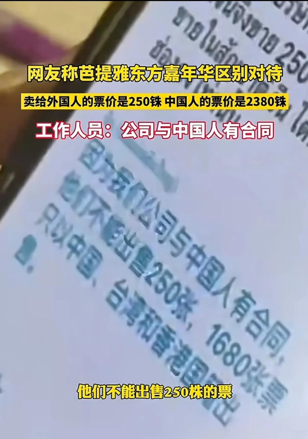 据报道,同一场活动,外国游客的票价仅为250泰铢,而中国游客的票价却高达2386泰铢,相差近十倍!