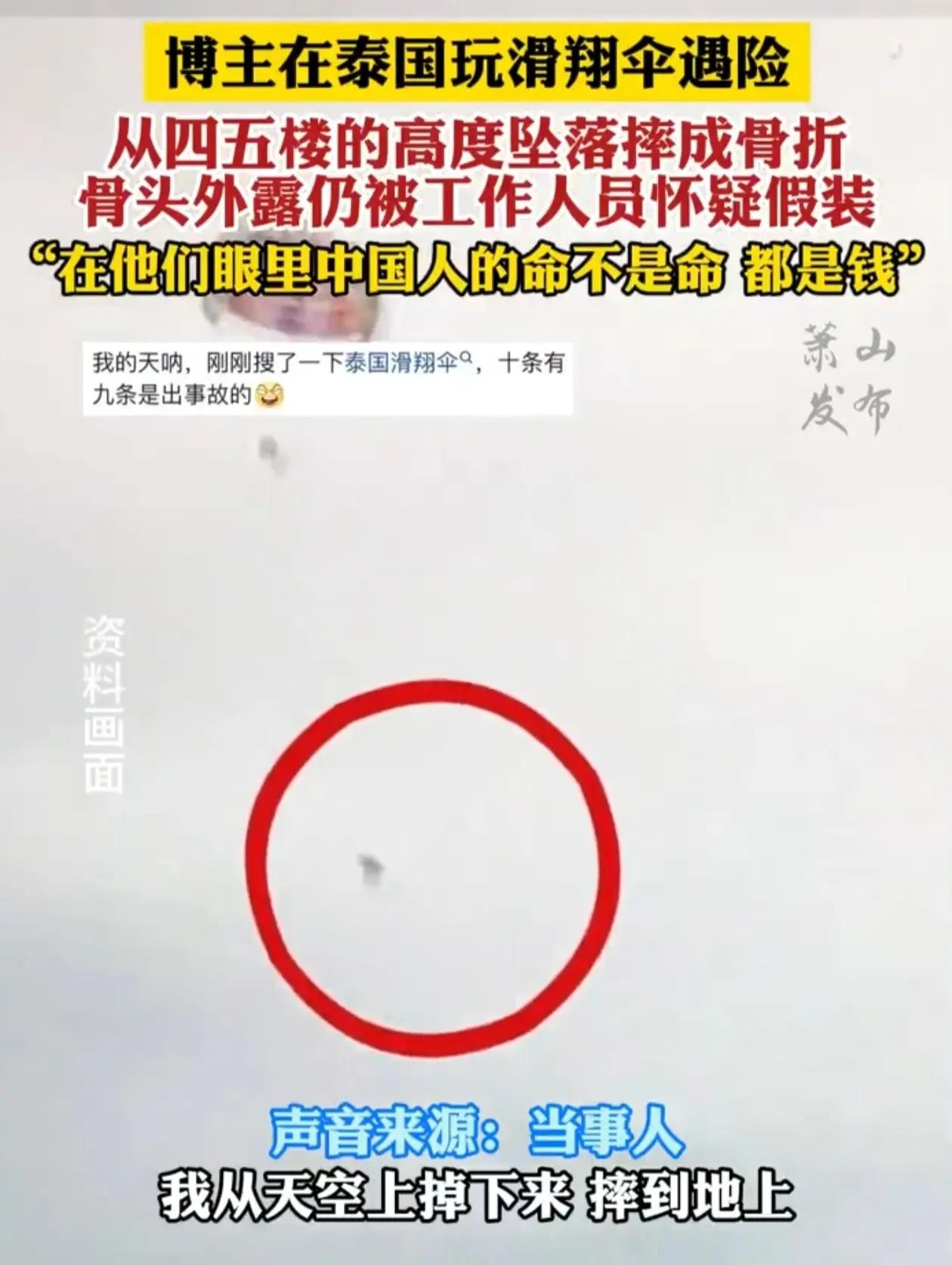 就在东方嘉年华事件持续发酵之际,之前就有一起悲剧也在泰国普吉岛上演。一位中国网红在体验滑翔伞时遭遇事故,从四五楼的高度摔进海里,导致小腿断裂、骨头外露。