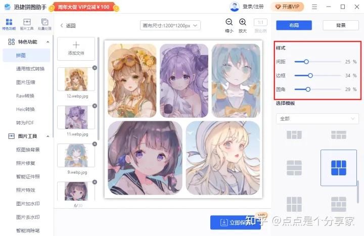 多种模板可选,最多可一次上传16张图操作,右边可以调节边框、间距、圆角