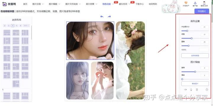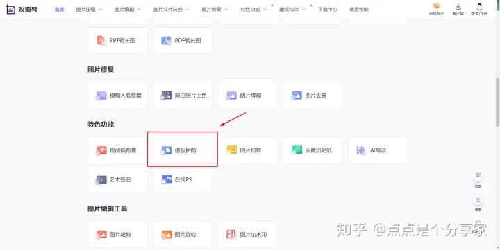 一个图片编辑工具网站,有很多常用的编辑工具,图片压缩、格式转换、识别图片文字、修改尺寸和分辨率等等,还有一些特色功能,模板拼图、智能证件照、照片修复,也是很好用的,拼图的基础模板很多,直接滑动鼠标即可缩放每张图片比例,宝藏工具网站,很适合收藏起来哦