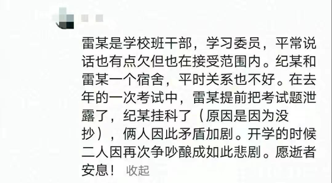 后来,一些知情人爆料称,伤者都是电气专业的大四学生。纪某在学校内长期遭受其他三人的欺凌,其中雷某对他的伤害最为严重。两人的矛盾再次激化,原因可追溯到上学期的一次考试。